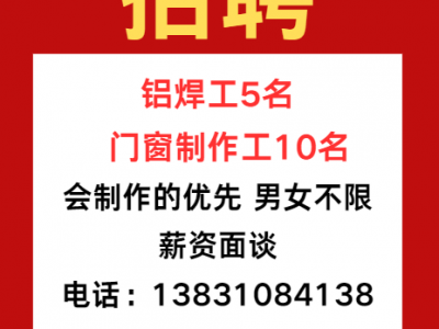招铝焊工5名 门窗制作工10名,会制作的优先,男女不限,薪资面谈 电话:13831084138/15933882008