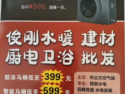 俊刚水暖建材 厨电卫浴批发 主营:热立方空气能 专业:精装水电 旧房改造 水电安装管材:伟星 日丰 联塑,以及地暖管材,马桶,浴室柜,花洒,烟机、灶具、热水器,批发与零售 地址:(合林超市)安居南门红绿灯东行188米路南(俊刚水暖)电话/微信:18631093383 18849031044