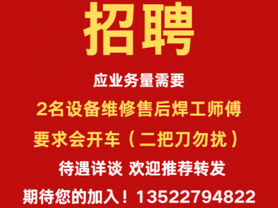 应业务量需要2名设备维修售后焊工师傅,要求会开车(二把刀勿扰), 待遇详谈,欢迎推荐转发,期待您的加入!