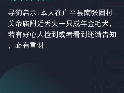 寻狗启示:本人在广平县南张固村关帝庙附近丢失一只成年金毛犬,若有好心人捡到或者看到还请告知,必有重谢!联系电话:一九三三三二二二零零八