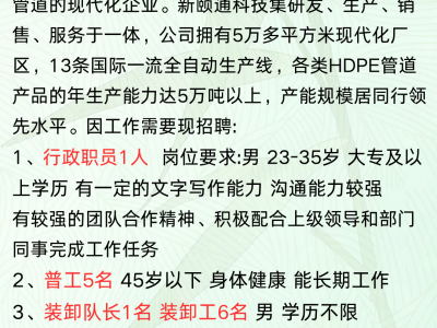 招聘 邯郸市新颐通管业科技有限公司是一家国有中型企业,专业生产市政工程用高密度聚乙烯(HDPE)管道的现代化企业。新颐通科技集研发、生产、销售、服务于一体,公司拥有5万多平方米现代化厂区,13条国际一流全自动生产线,各类HDPE管道产品的年生产能力达5万吨以上,产能规模居同行领先水平。因工作需要现招聘: