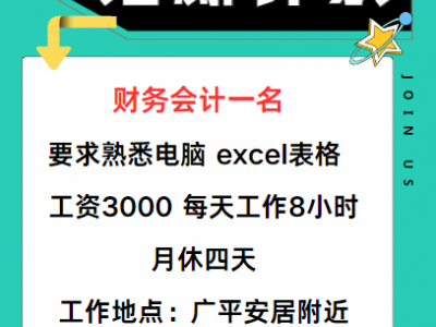 招聘 财务会计一名 要求熟悉电脑 excel表格 工资3000 每天工作8小时 月休四天 工作地点:广平安居附近