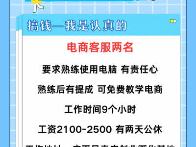 招聘电商客服两名,要求熟练使用电脑,有责任心,熟练后有提成,可免费教学电商,工作时间9个小时,工资2100-2500,有两天公休,工作地址:广平县袁庄创业孵化基地