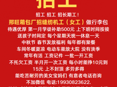 邢旺箱包厂招缝纫机工(女工)做行李包,待遇优厚,第一月学徒补助500元