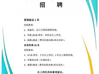 河北澳恩实业有限公司招聘 营销副总1名 业务经理10名 以上岗位具体事项面议。 联系电话 刘女士