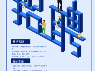 招聘 移动客服 负责接听电话 为客户解答业务内容 18-40 岁 良好的服务意识 应变能力 耐心 责任心强 8:30-12:00,2:00-6:30(单体) 时间点自由不耽误接送孩子,上6休1!广平地址:中央公园北门对面西50米。