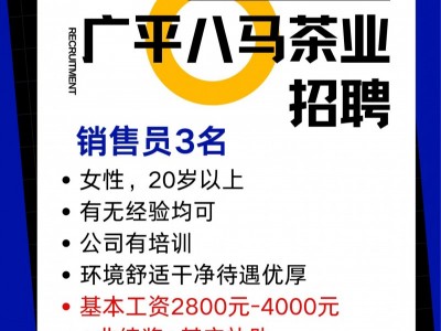 广平八马茶业招聘销售员3名,女性,20岁以上,有无经验均可,公司有培训。环境舒适干净,待遇优厚,基本工资2800元—4000元+业绩奖+其它补助电话:15100002217,13473042200,2528558