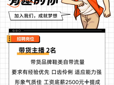 招聘带货主播2名 带货品牌鞋类自带流量 要求有经验优先 口齿伶俐 适应能力强 形象气质佳 工资底薪2500元➕提成 能播下来工资一般6000➕ 试用期3天
