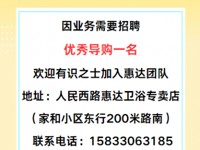 惠达卫浴因业务需要招聘优秀导购一名,欢迎有识之士加入惠达团队