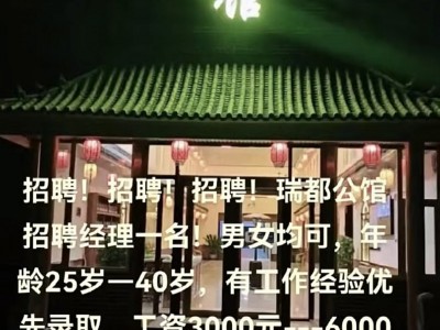招聘!招聘!招聘!瑞都公馆招聘经理一名!男女均可,年龄25岁—40岁,有工作经验优先录取。工资3000元---6000元!有意者联系 ,地址;肥乡区元古镇金河苑西行一百米路北刘先生