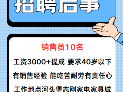 招聘销售员10名,工资3000+提成,要求40岁以下,有销售经验,能吃苦耐劳有责任心,工作地点河头堡志刚家电家具城