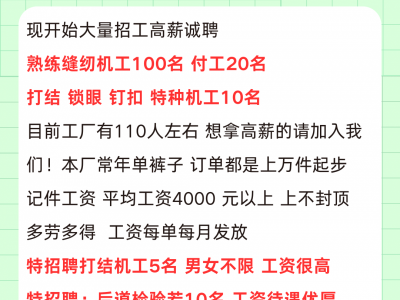 广平县腾飞制衣,现开始大量招工高薪诚聘熟练缝纫机工100名,付工20名,打结,锁眼,钉扣,特种机工10名,目前工厂有110人左右,想拿高薪的请加入我们!本厂常年单裤子,订单都是上万件起步,记件工资,平均工资4000 元以上,上不封顶,多劳多得 ,工资每单每月发放