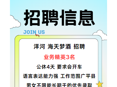 洋河 海天梦酒 招聘业务精英3名,公休4天,要求会开车,语言表达能力强,工作范围广平县,男女不限能长期干的优先录取工资3000到6000元不等欢迎有志之士加入我们的团队……