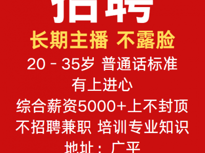 招聘:长期主播,不露脸,20-35岁,普通话标准,有上进心,综合薪资5000+上不封顶 ,不招聘兼职