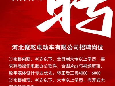 河北聚乾电动车有限公司招聘岗位 ①销售内勤,40岁以下,全日制大专以上学历,要求熟悉操作电脑办公软件,会图片ps与视频剪辑,数字媒体设计专业优先。转正后工资4000--6000