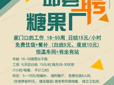 日结15元/小时免费住宿+餐补 (白班5元, 夜班10元)