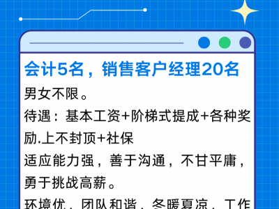 招聘:会计5名,销售客户经理20名,男女不限。