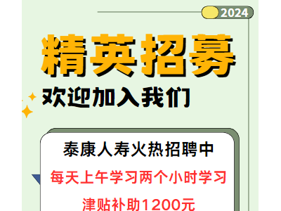 泰康人寿火热招聘中。每天上午学习两个小时学习津贴补助1200元,优秀者收入上不封顶!年龄25周岁到50周岁之间。名额有限!!想报名的朋友速速联系电话微信:15075056633