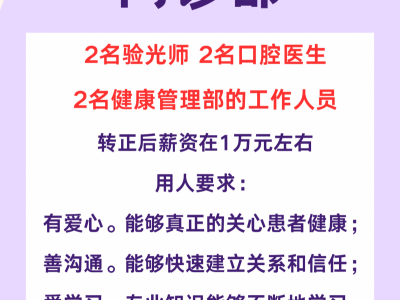 广平爱眼综合门诊部现在对外招聘2名验光师、2名口腔医生、2名健康管理部的工作人员,转正后薪资在1万元左右。用人要求: