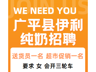 广平县伊利纯奶招聘,送货员一名,超市促销一名,要求,女,会开三轮车,有责任心,工资2500+全勤奖+公休。