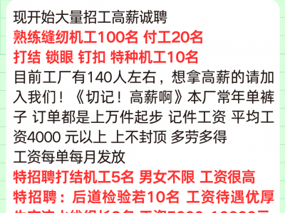 假期已过,广平县腾飞制衣,现开始大量招工高薪诚聘熟练缝纫机工100名,付工20名,打结,锁眼,钉扣,特种机工10名,目前工厂有140人左右,想拿高薪的请加入我们!《切记!高薪啊》本厂常年单裤子,订单都是上万件起步,记件工资,平均工资4000 元以上,上不封顶,多劳多得 ,工资每单每月发放