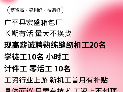 现高薪诚聘熟练缝纫机工20名 学徒工10名 小时工 计件工 零活工 10名