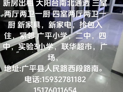 新房出租大阳台南北通透三室两厅两卫一厨四室两厅两卫一厨新家具,新家电,拎包入住,紧邻广平小学,二中,四中,实验3小学,联华超市,广场, 地址:人民路西段路南。 电话: