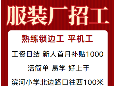服装厂招工,常年招熟练锁边工,平机工,工资日结,新人首月补贴1000,活简单易学好上手,地址:滨河小学北边路口往西100米