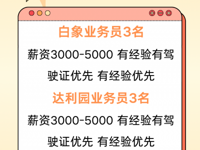 广平县骁栋食品门市招聘白象业务员3名薪资3000-5000,有经验有驾驶证优先,有经验优先。达利园业务员3名薪资3000-5000,有经验有驾驶证优先,有经验优先。库管一名,有经验优先,薪资2000_3000送货员一名