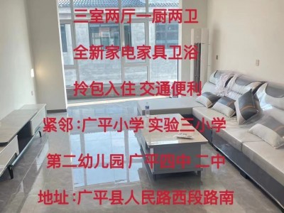 新房首租 南北通透户型 三室两厅一厨两卫 四室两厅一厨两卫 全新家电家具卫浴 拎包入住 交通便利 紧邻:广平小学 实验三小学 第二幼儿园 广平四中 二中地址:广平县人民路西段路南