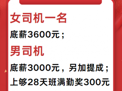 男司机底薪3000元,另加提成;
