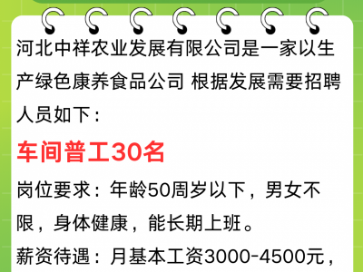 河北中祥农业发展有限公司是一家以生产绿色康养食品公司,根据发展需要招聘人员如下: