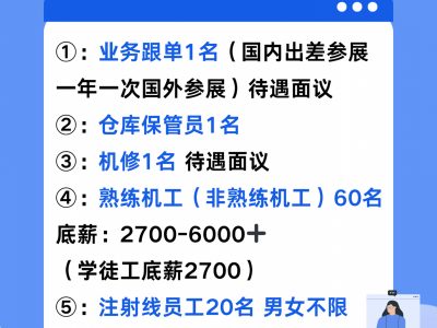 ①:业务跟单1名(国内出差参展,一年一次国外参展)待遇面议