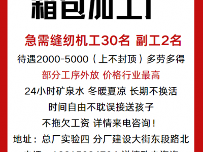 箱包加工厂: 急需缝纫机工30名,副工2名。