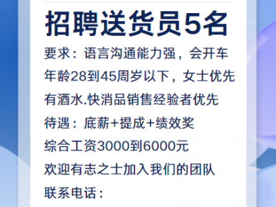 广平县巴比熊面包招聘送货员5名,要求:语言沟通能力强,会开车,年龄28到45周岁以下,女士优先。有酒水.快消品销售经验者优先