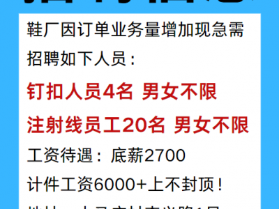 鞋厂因订单业务量增加现急需招聘如下人员: