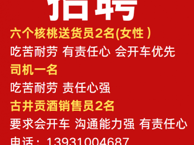 招聘:六个核桃送货员2名(女性)吃苦耐劳,有责任心,会开车优先;