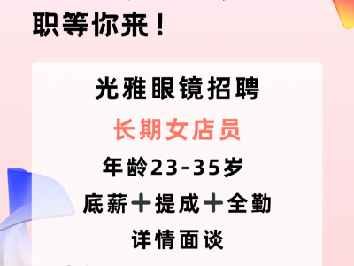 光雅眼镜招聘长期女店员,年龄23——35岁。底薪➕提成➕全勤。详情面谈。地址:双李大厦往东100米路北