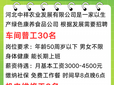 河北中祥农业发展有限公司是一家以生产绿色康养食品公司,根据发展需要招聘人员如下: