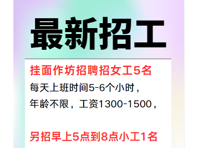 招女工5名,每天上班时间5-6个小时,年龄不限,工资1300-1500,