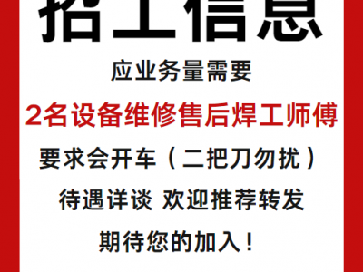 应业务量需要2名设备维修售后焊工师傅,要求会开车(二把刀勿扰), 待遇详谈,欢迎推荐转发,期待您的加入!
