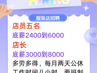 服装店招店员五名,店长,底薪3000到8000,店员,底薪2400到6000,多劳多得,每月两天公休,工作时间八小时,两班制,福利待遇从优,详情电联