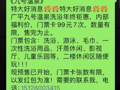 《九号温泉》 特大好消息[烟花][烟花]特大好消息[烟花][烟花] 广平九号温泉洗浴年终钜惠,内部福利价,门票卡99元7次,数量有限,售完为止。 门票包含:洗浴、游泳、毛巾、一次性洗浴用品、汗蒸休闲、影视厅、儿童乐园等,二楼休闲区随便玩!!! 现预售已开始,门票卡张数有限,以发红包为准!需要的联系我[玫瑰][玫瑰][玫瑰] 电话微信同步