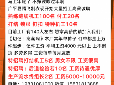 马上年底了,不挣钱咋过年啊广平县腾飞制衣,现开始大量招工高薪诚聘熟练缝纫机工100名,付工20名,打结,锁眼,钉扣,特种机工10名,目前工厂有140人左右,想拿高薪的请加入我们!《切记!高薪啊》本厂常年单裤子,订单都是上万件起步,记件工资,平均工资4000 元以上,上不封顶,多劳多得 ,工资每单每月发放