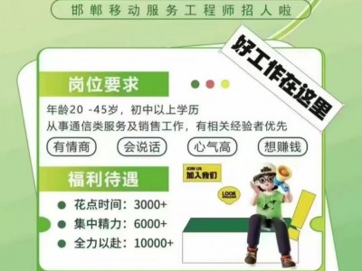 年龄20-45岁,初中以上学历从事通信类服务及销售工作,有相关经验者优先有情商会说话心气高想赚钱