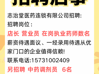 店长 营业员 在岗执业药师数名 薪资待遇面议、一经录用待遇从优,家门口的企业值得信赖! 联系电话:15731002409