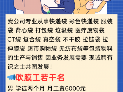 吹膜工若干名,男,学徒两个月,月工资6000元;学成月工资10000-15000元