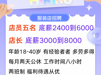 服装店招店员五名,店长,底薪3000到8000,店员,底薪2400到6000,年龄18-40岁,有经验者者,多劳多得,每月两天公休,工作时间八小时,两班制,福利待遇从优,招聘美甲师一名,五五分成,详情电联,
