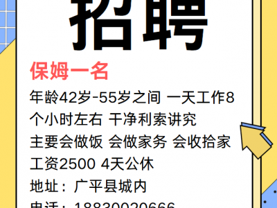找保姆一名,年龄42岁-55岁之间,一天工作8个小时左右,干净利索讲究,主要会做饭,会做家务,会收拾家。工资2500,4天公休 地址:广平县城内