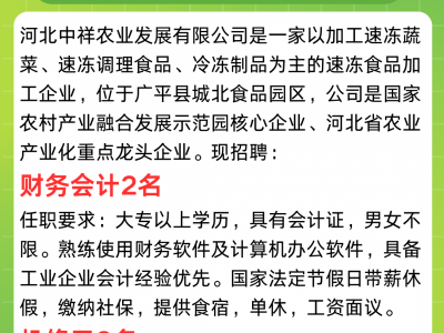 河北中祥农业发展有限公司是一家以加工速冻蔬菜、速冻调理食品、冷冻制品为主的速冻食品加工企业,位于广平县城北食品园区,公司是国家农村产业融合发展示范园核心企业、河北省农业产业化重点龙头企业。现招聘: